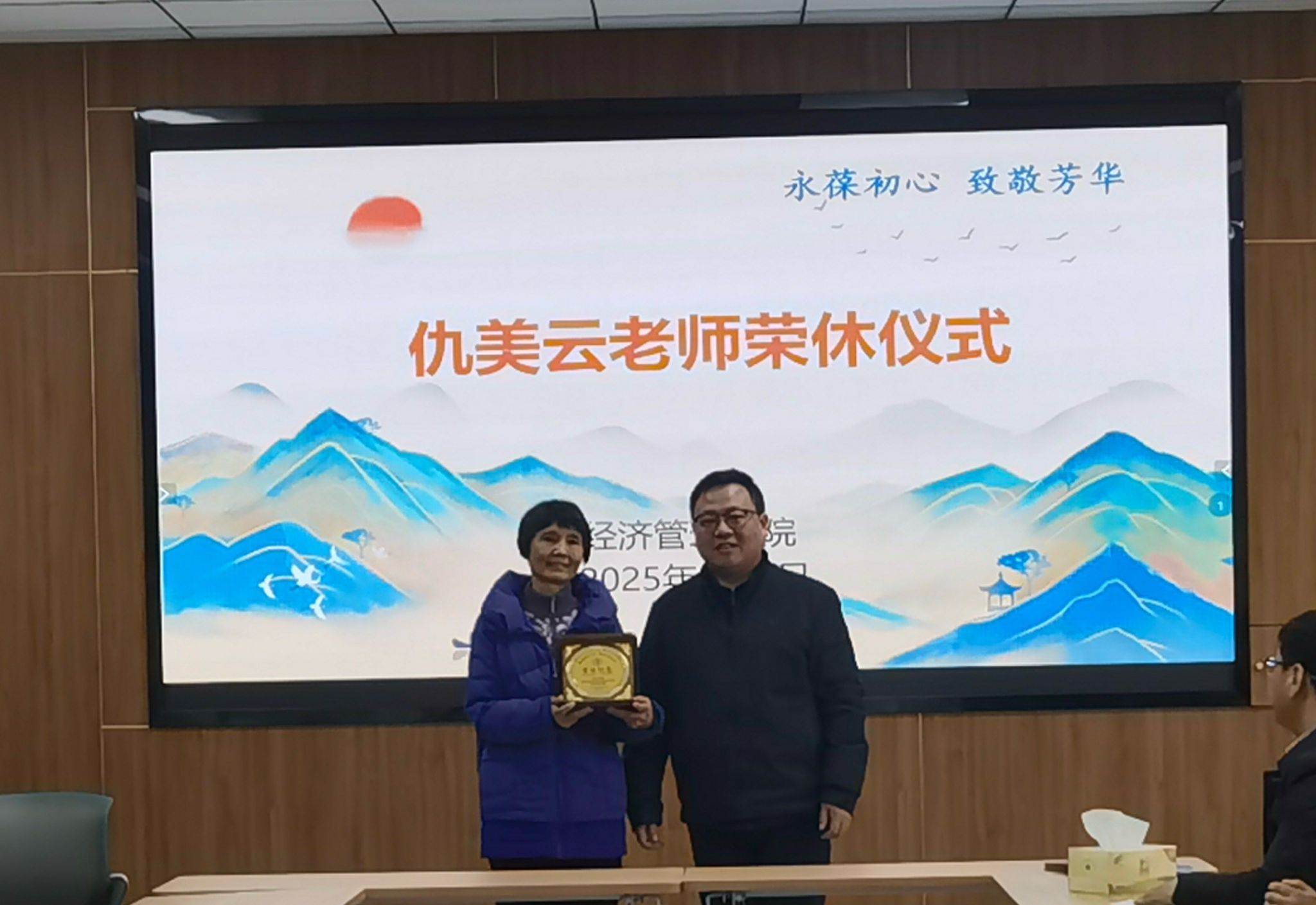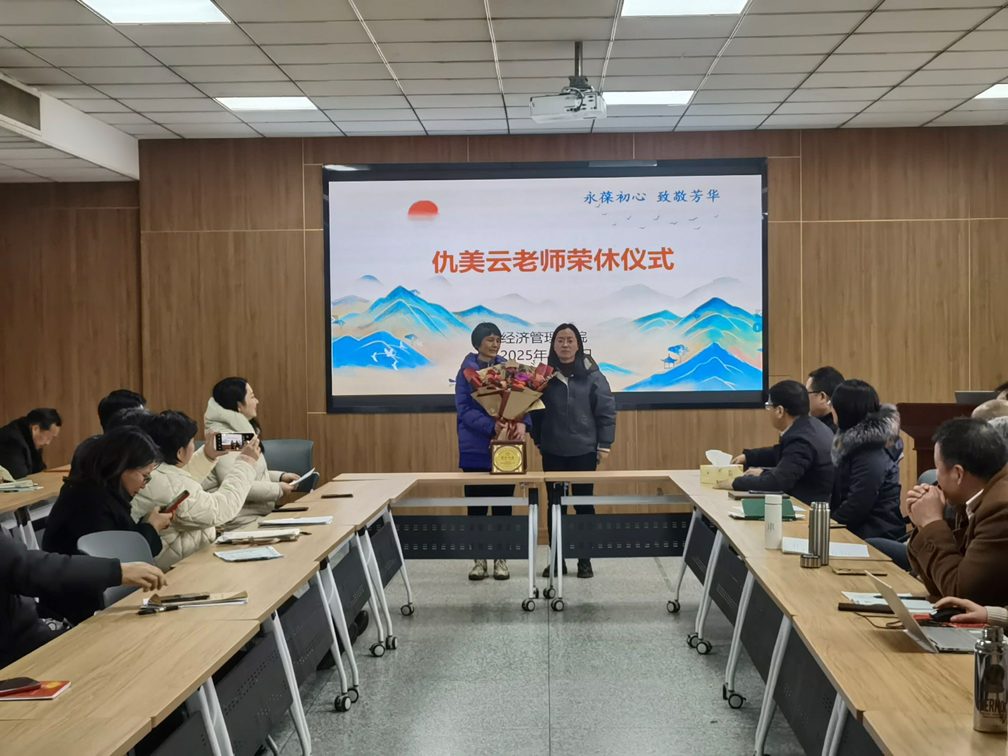 1月8日下午,经济管理学院在致知楼604会议室为原办公室主任仇美云老师举办荣休仪式。校人事处处长张晓冬、经济管理学院党政班子及全体教职工参加了本次活动。荣休仪式由经济管理学院党总支副书记范晔主持。