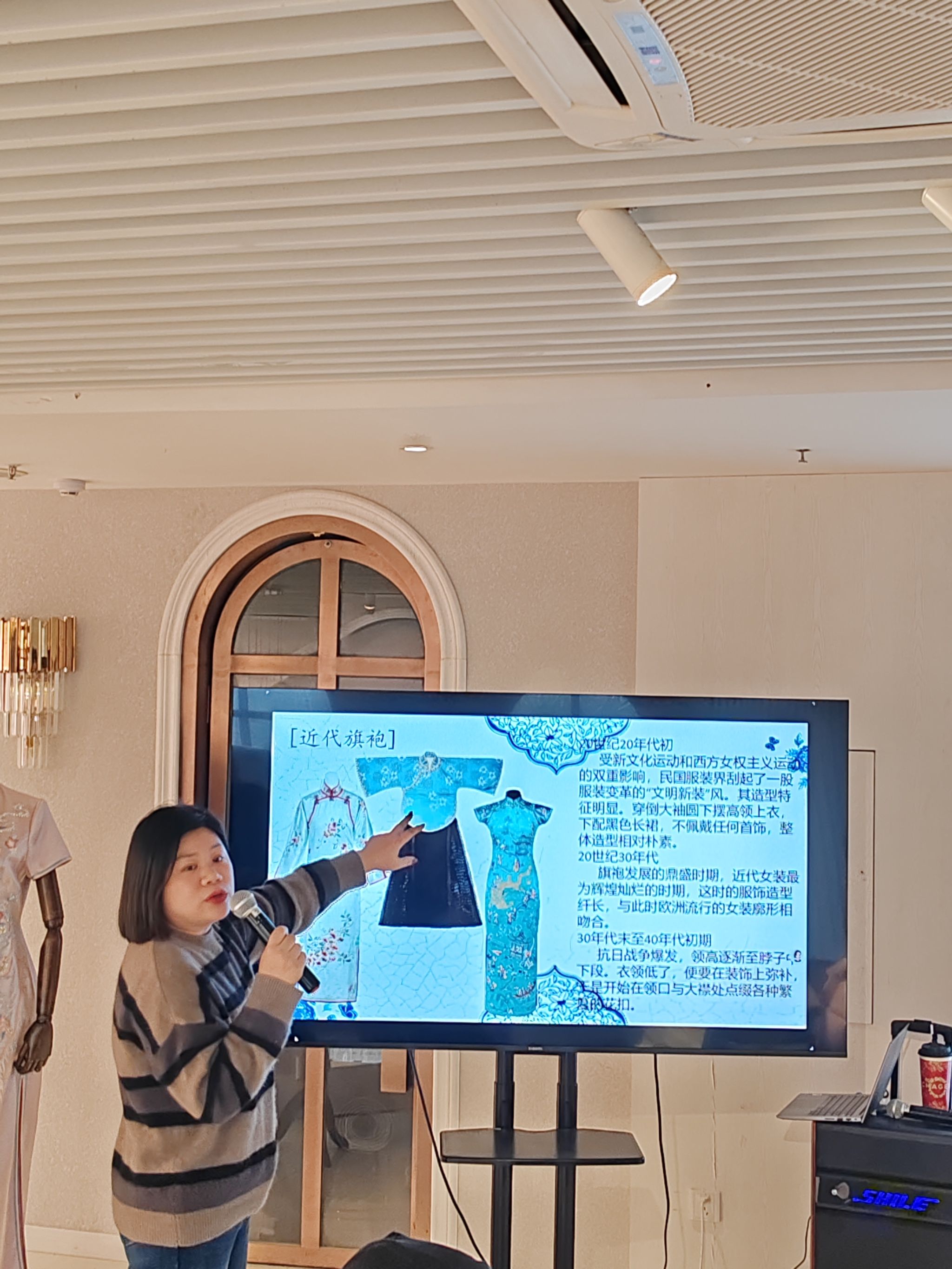 活动中,三润集团设计总监张剑女士从旗袍的起源、发展历史、派别特征、工艺演变等方面为大家讲解了“旗袍美学”。旗袍流传至今,之所以依然历久弥新,受世人青睐、令世界折服,源于其浓郁的民族风格和东方气韵以及深厚的文化底蕴和审美意蕴,是几千年来中国历代服装精髓的积淀,它连接起中华文明的过去与未来,张剑在讲解中将生活与艺术融为一体,展示了国粹的魅力。分享过程轻松愉悦,让大家留下了“旗妙”的记忆。