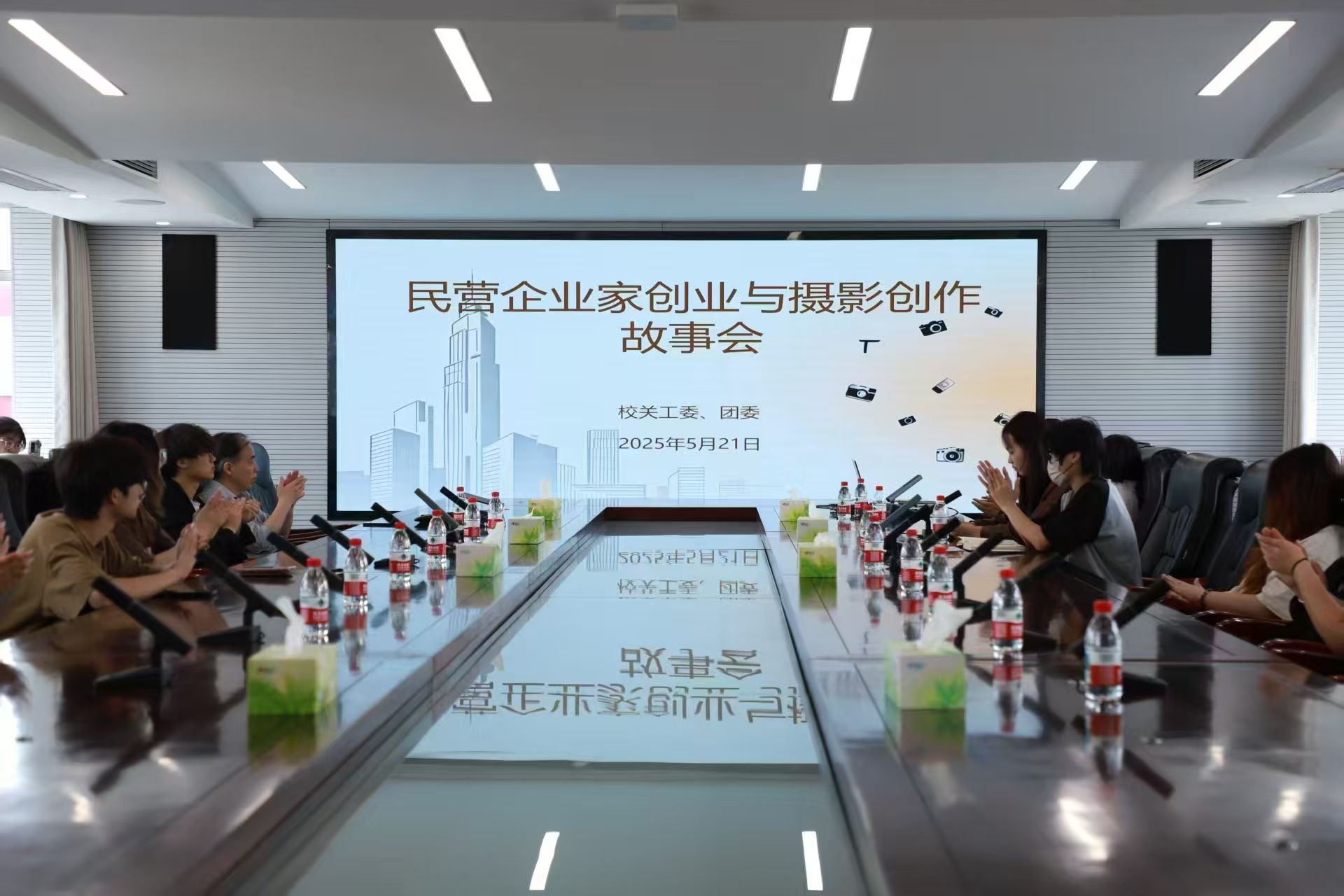 为扎实开展“银龄护航青春梦”行动4Q·3C·2Y项目,帮助团学干部培养创业精神与创新思维,激发创业激情与创新活力,5月21日下午,校关工委、团委在崇川校区行政楼三楼会议室联合举办民营企业家创业与摄影创作故事会。校关工委秘书处秘书长、离退休处处长、工会主席程莉,校团委副书记张禧嘉,关工委理论指导组组长刘建明以及关工委老教师、团学干部代表、新媒体中心学生骨干近40人参加了活动。